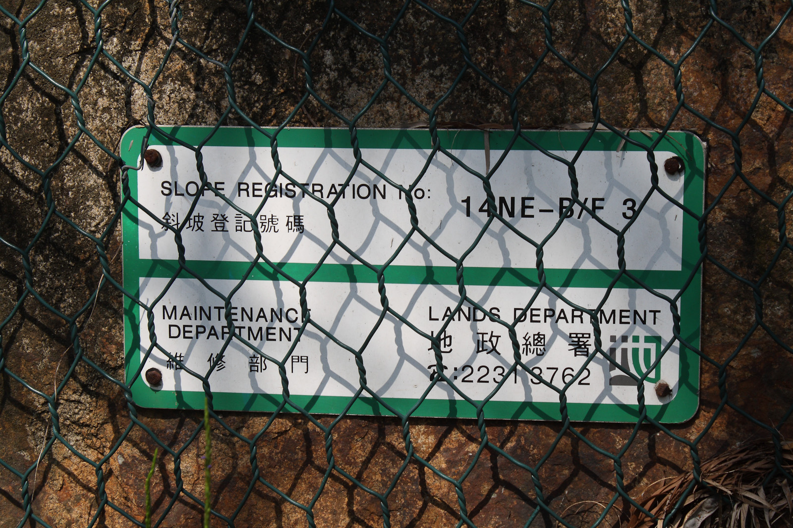 香港地方不大,山还占掉了一大半面积,很多建筑都是修在山上的,因此很多地方都有盘山路。路两旁的斜坡都会用铁丝网给围起来,然后上面挂上这么一个牌子;还有些没围上的,旁边也会附上说明,说这里危险,土质还待勘查,请路人小心云云,下面署名什么什么署。