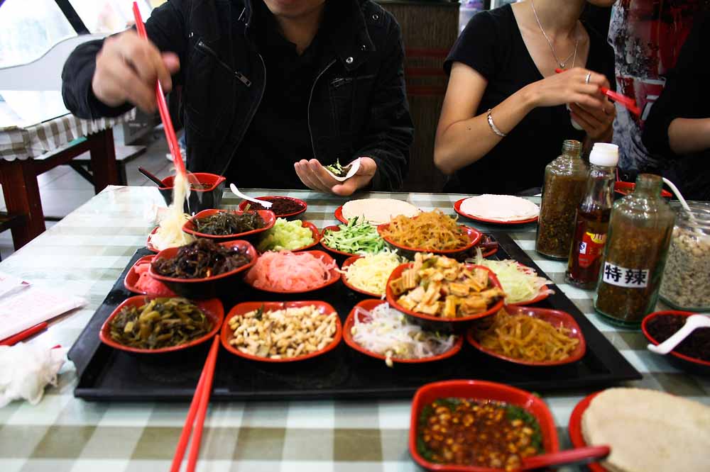 除了走走看看,再顺带提一下贵阳的小吃。之所以一笔带过,实在是因为小弟我没法体会其精妙之处,比如久闻大名的丝娃娃,虽然我也想到自己不会爱吃,但吃了以后发现,我还真是不爱吃,特别是一种据说是逢菜必放的称之为折耳根的植物最是让我不习惯,为此没有少受鄙视,没有缘分啊!不过既然都吃过了,也顺便做个名词解释,所谓丝娃娃,外地人可以把它想象成类春卷的食物,拿出一块饼(跟吃烤鸭一样,不过这张饼做得比较讲究,还分不同材料的),包上各种丝(类似饭前开胃菜那种,海带丝、萝卜丝、豆皮丝、折耳根等),然后把一头一卷,这就跟包小娃娃一样(估计就是因此得名),之后舀一勺自己配的调味汁往这可怜的孩子头上一浇趁他还没尿裤子的时候一口吞了就好啦。