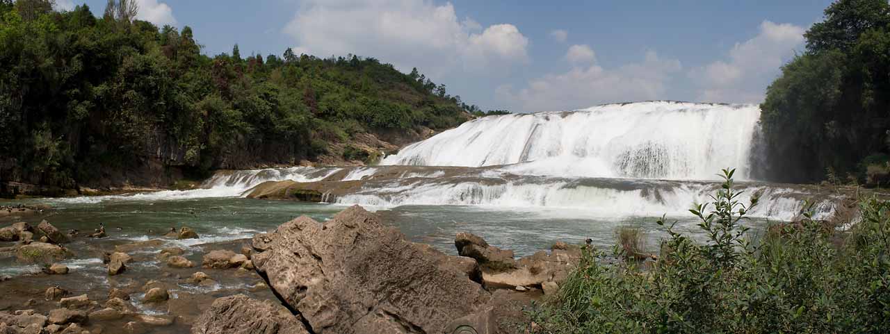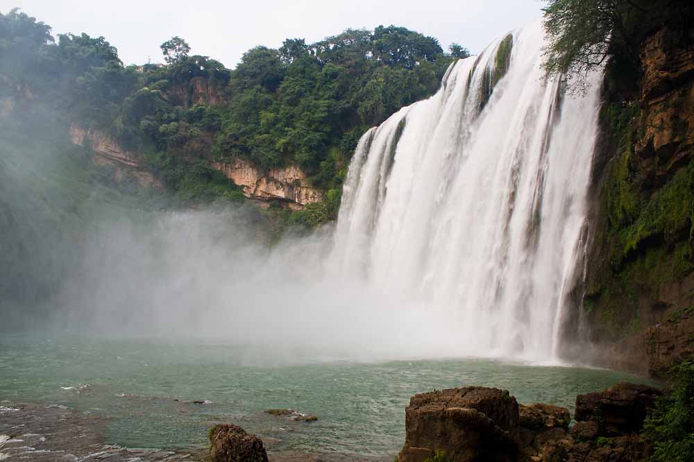 我去的几个地方,包括天河潭、花溪公园、黄果树等,都有着大大小小形式不一的瀑布,充沛的水量一度使我疑惑前阵子为什么会有旱灾。后经专家解释才了解到,贵州的降水受季节影响比较大,而且因为很多什么喀斯特地貌所以留不住水,都渗到地底下去了,好像是这么个意思。之前对贵州的了解除了茅台就是黄果树,所以这次也特地去参拜了一下,但是由于有了充分的心理准备,所以看到大瀑布时反倒少了一些惊喜的感觉(而且山路上密密麻麻都是人,基本上是排着队从瀑布脚挪动到了水帘洞再挪动下山)。不过之前在黄果树另一个景区天星桥所看到的银珠坠潭倒是彻底震撼了我,与陡坡塘(黄果树景区最后一个景点,不高但很宽的瀑布)、大瀑布那种横排窗帘式的走向不同,这个瀑布到达落差处时是排成一个大圆弧向下倾泄,好似怒吼着冲进了一个深渊,从入口往下看,让人有股纵身跳入的冲动(可怕的念头……)。另外,其他两个瀑布是看不到源头的,一进景区就直接看到水帘,但这个景点的路线却是一路顺着奔腾咆哮的河水走,看着水流越来越急气势越来越壮阔并最终冲入大坑,那种感觉实在是小弟这贫乏的语言所描述不出的。