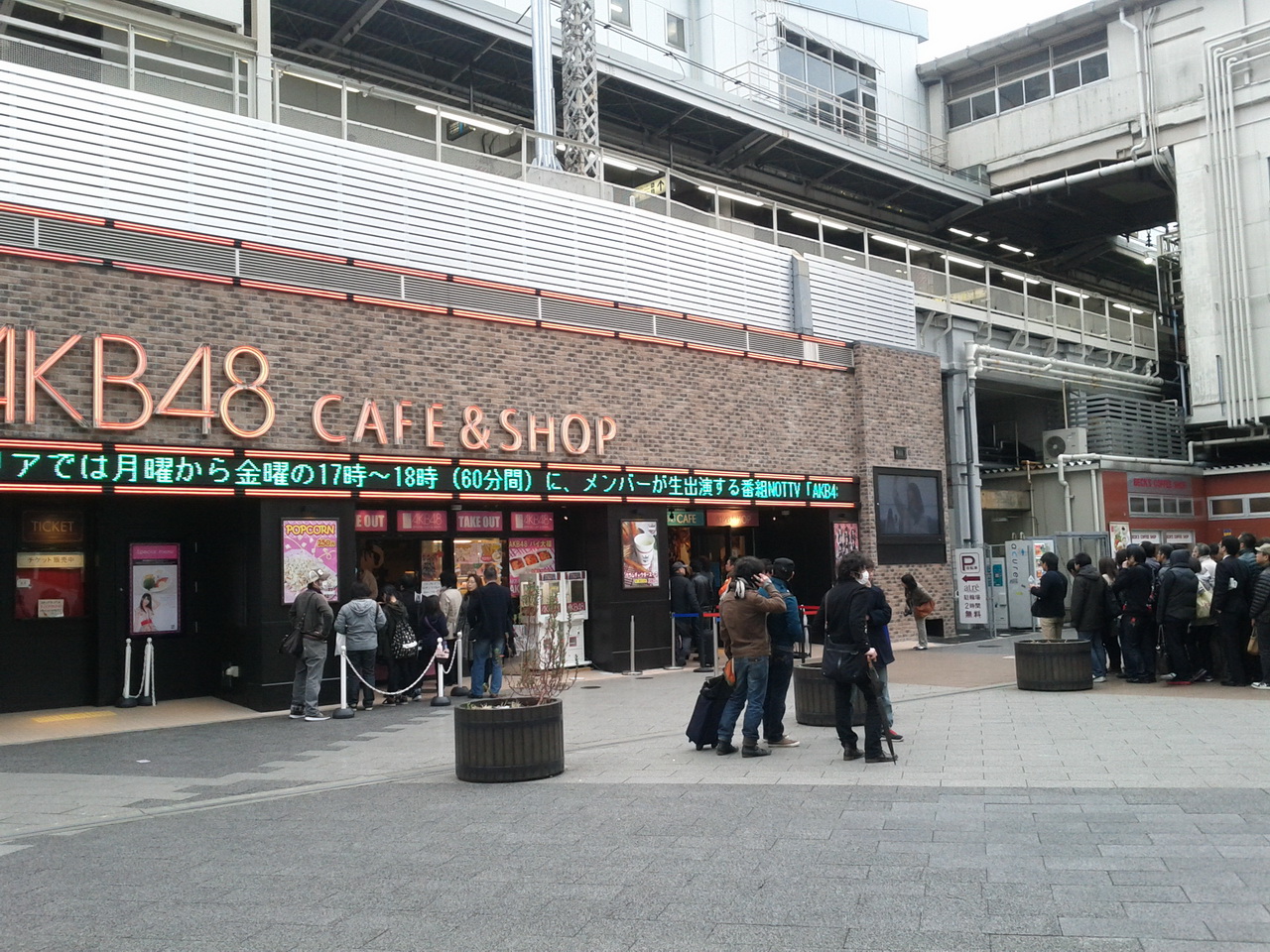 5、再来一张图——秋叶原 JR 站口,一帮死宅在等进场看 AKB48 的现场秀(应该是吧,要不排队干嘛?),队伍在右上角(当时不是拍照的重点= =b),阿宅们排成了很整齐的三队,注意队首和店门之间把一条路给让出来了……你可能会说这他妹的根本不是路好伐只是地砖铺出来的一条线啊,但事实是小日本真就把它给让出来了,而且一帮心急火燎的死宅居然能够很淡定的等着(据我观察五分钟都放不了一两个人),真是让人不服不行。